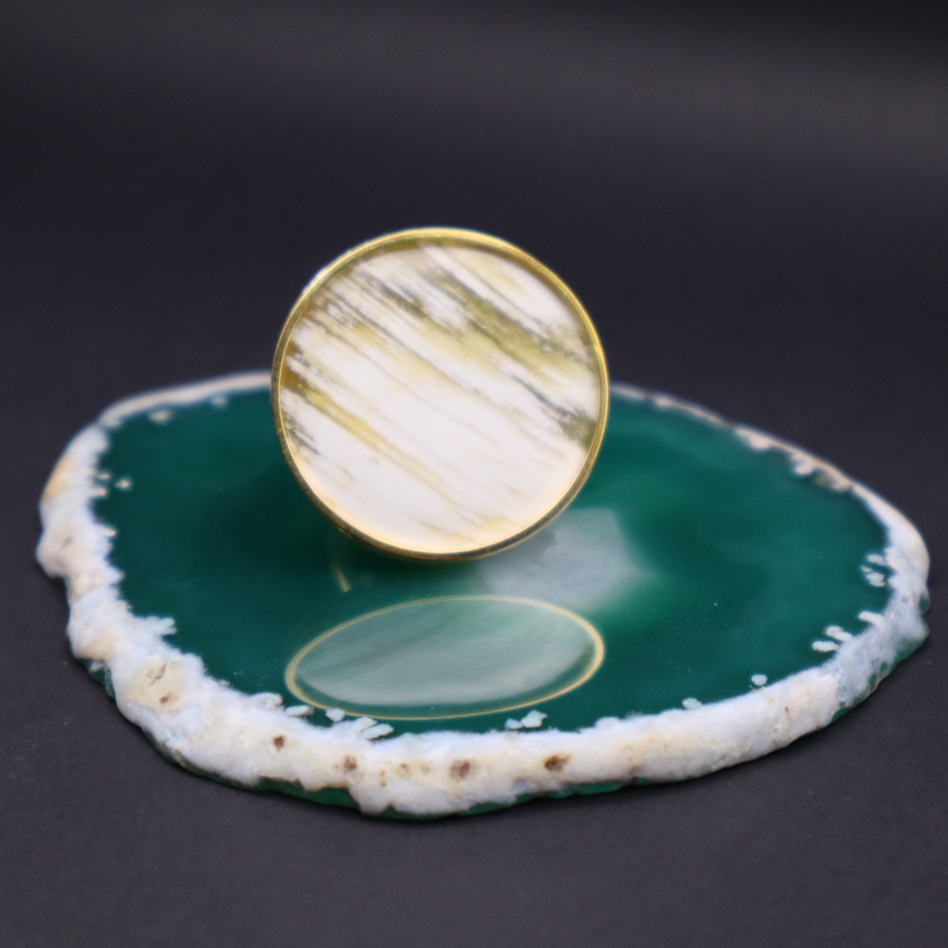 Anillo de asta con aro fino de metal en color dorado.