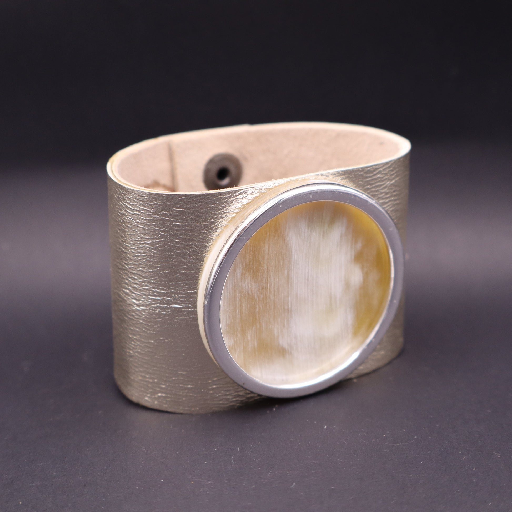 Brazalete en Piel Metalizada Dorada con dije redondo de asta y aro de metal color plata.