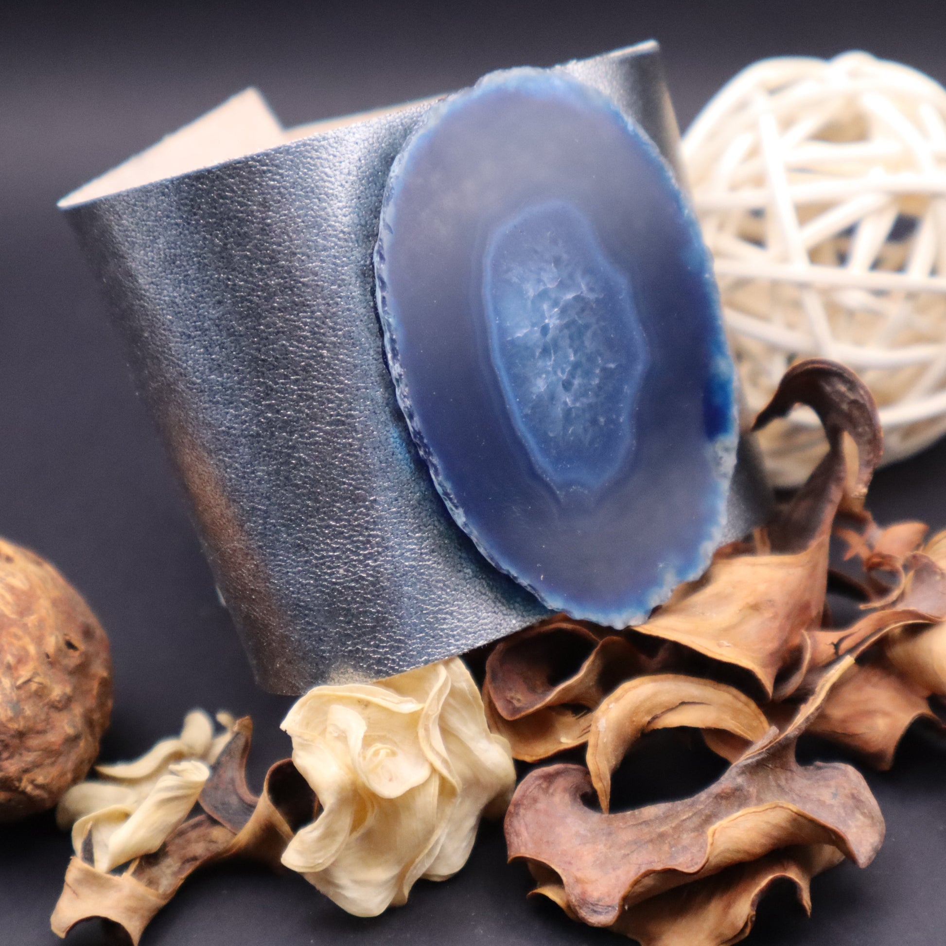 Brazalete en Piel Metalizada plomo con ágata en tonos de azul.