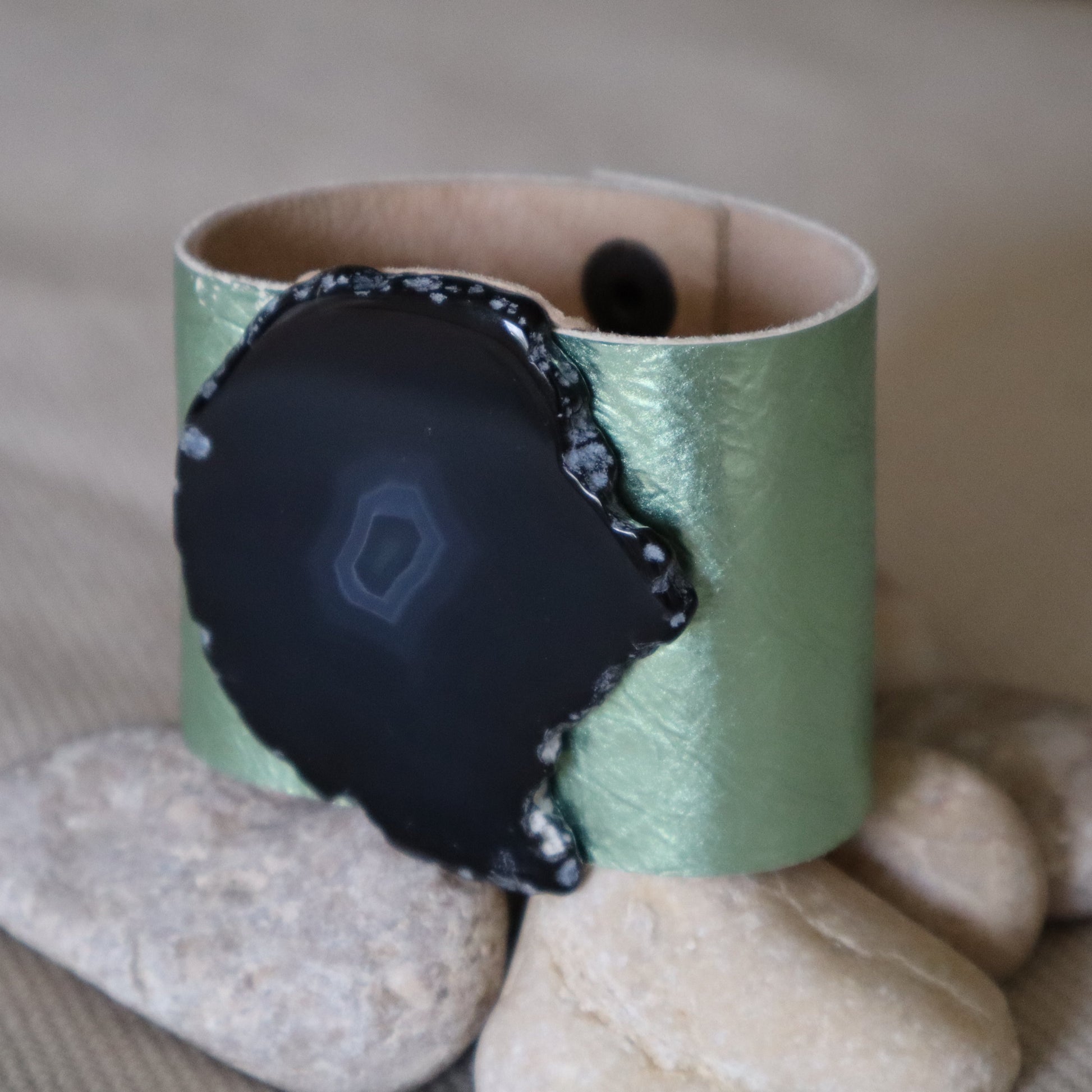 Brazalete en piel metalizada verde manzana y ágata en tonos de negro