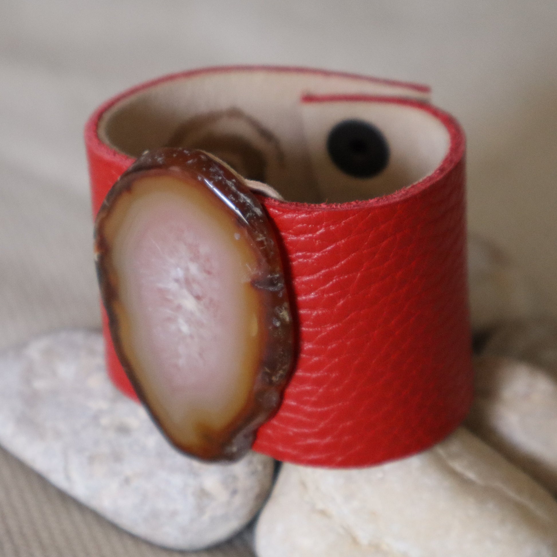 Brazalete en piel color rojo y ágata en tonos de marrón y cristal