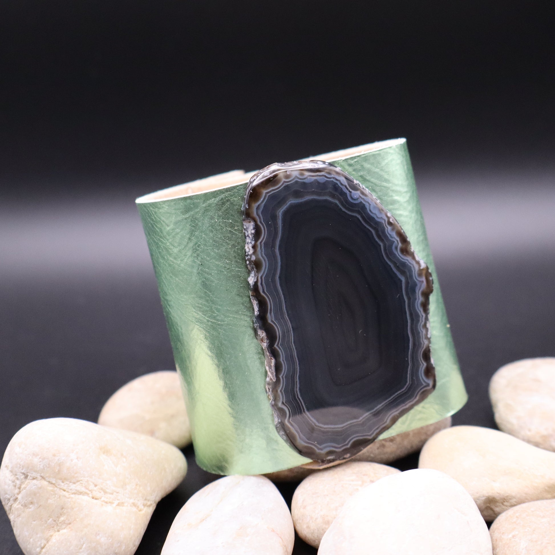 Brazalete en piel metalizada verde manzana y ágata en tonos de negro.