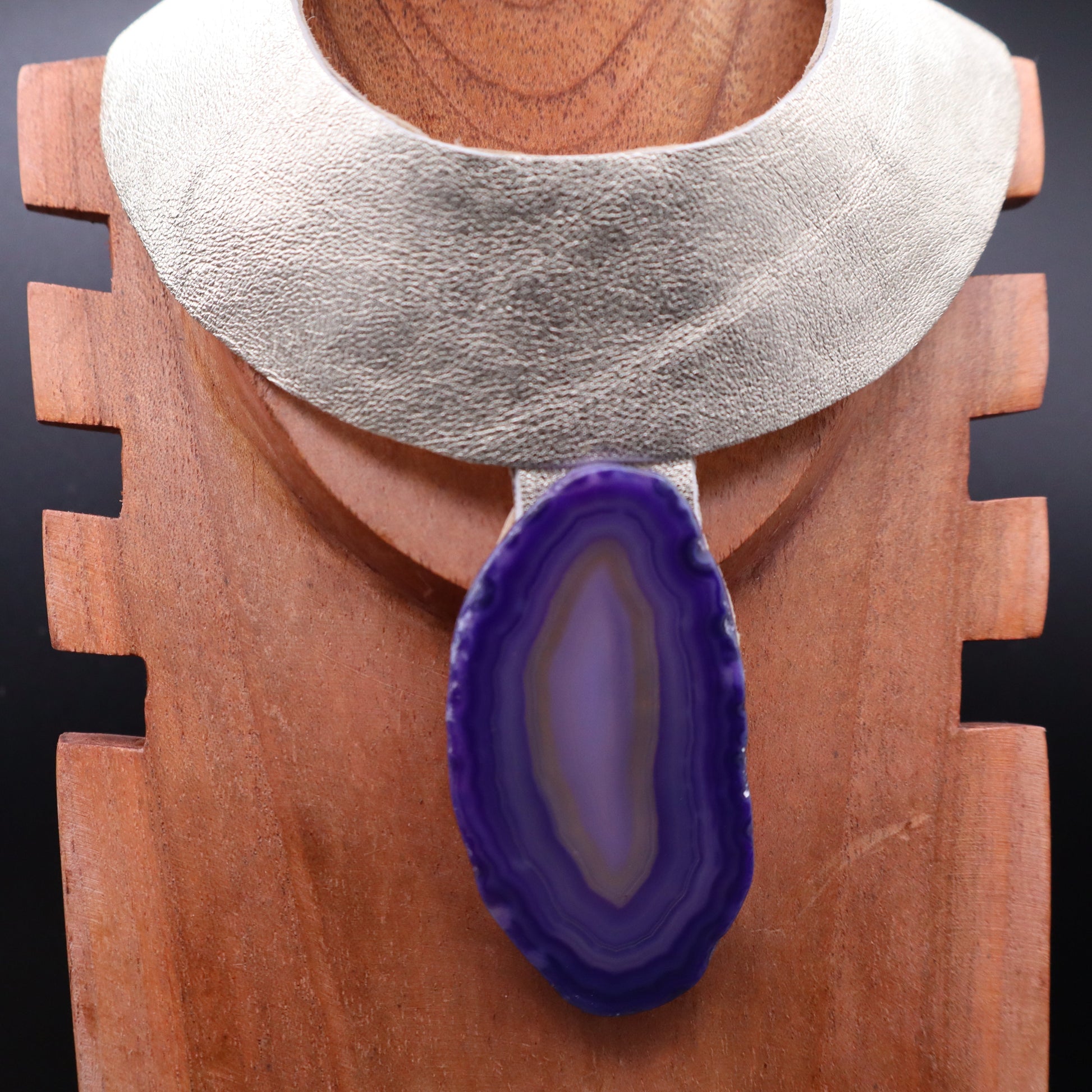 Choker en piel metalizada dorada y ágata en tonos de morado y cristal
