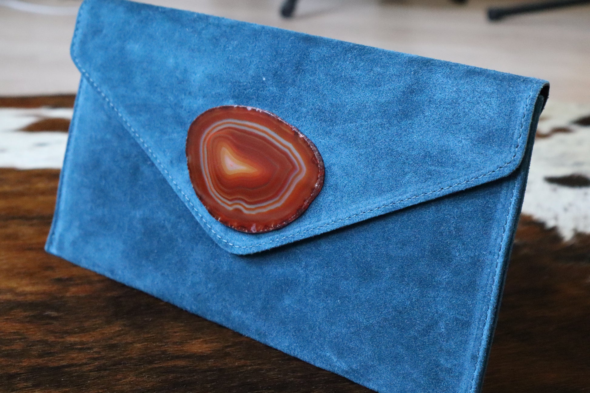Clutch de piel de ante color azul petróleo con ágata en tonos de marrón.