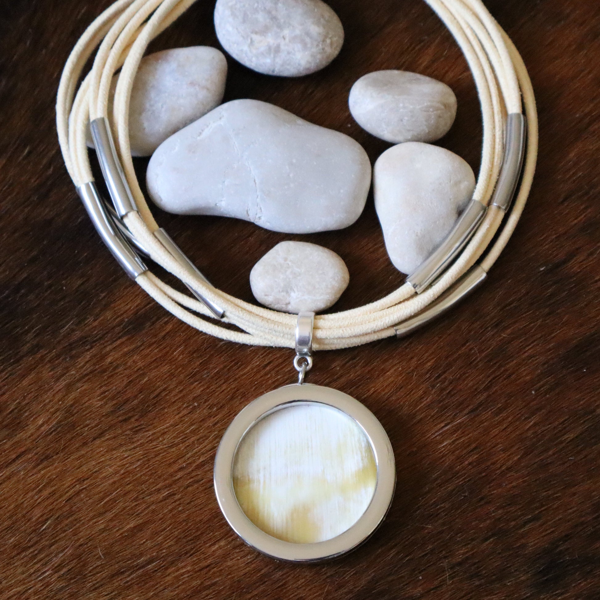 Collar de cordón de ante redondo color crema con abalorios tubulares metalicos y dije de asta circular mediano con aro de metal.