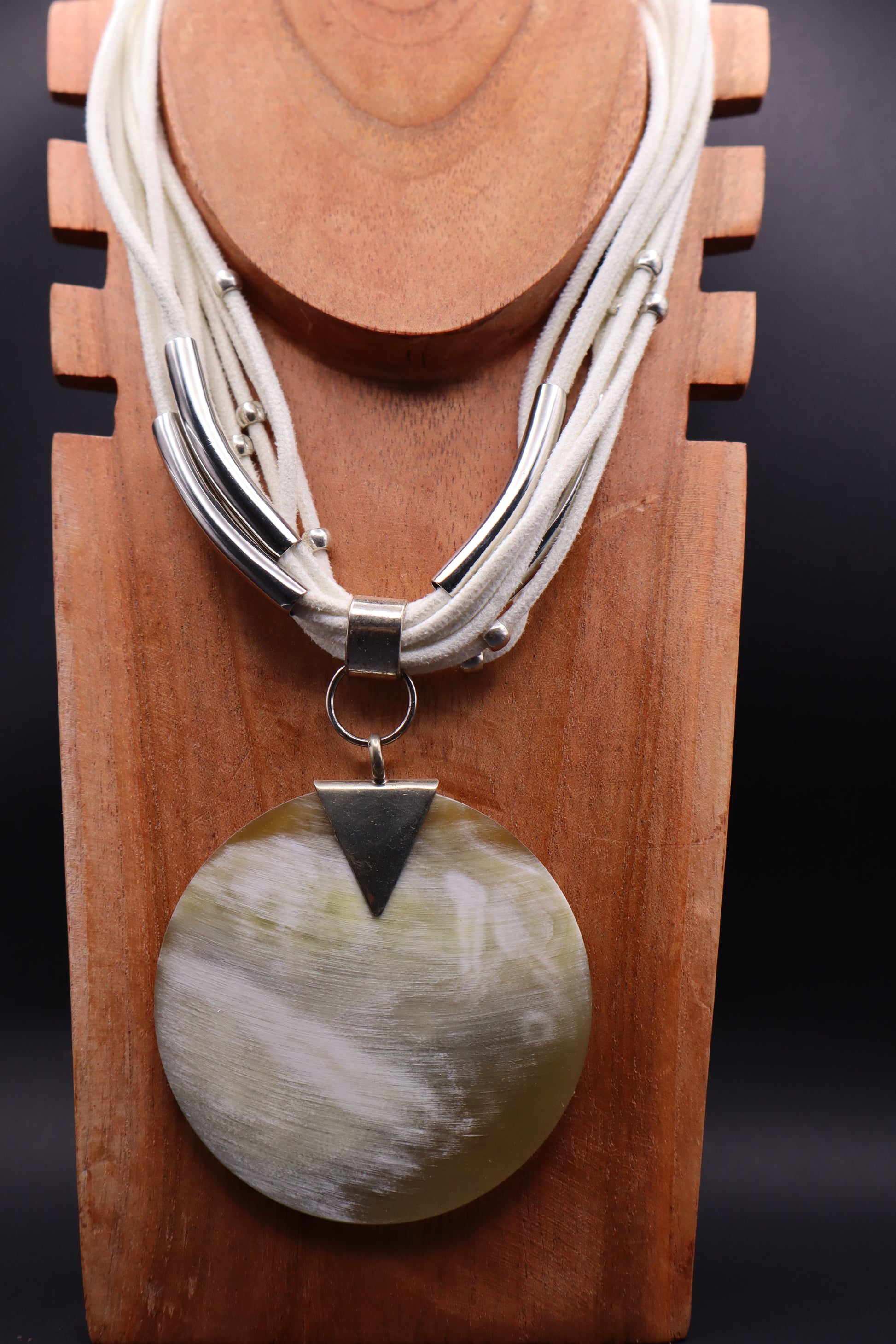 Collar de cordón de ante redondo color blanco con abalorios en acero y dije de asta circular grande de 7cm.