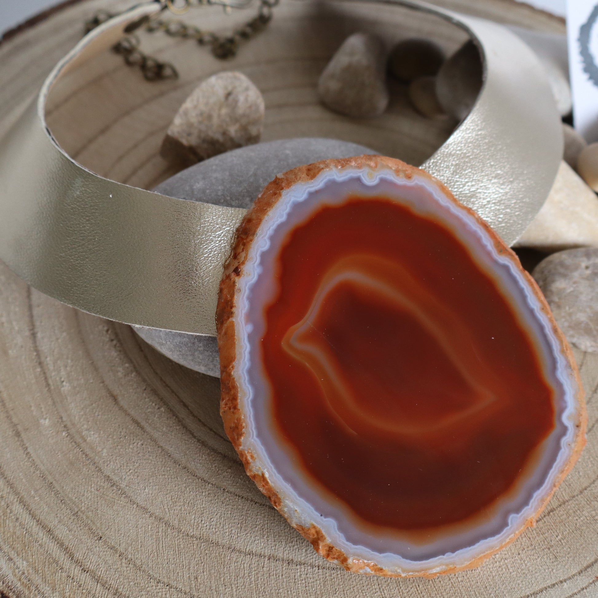Collar en piel metalizada dorada y ágata de Brasil en tonos de marrón.
