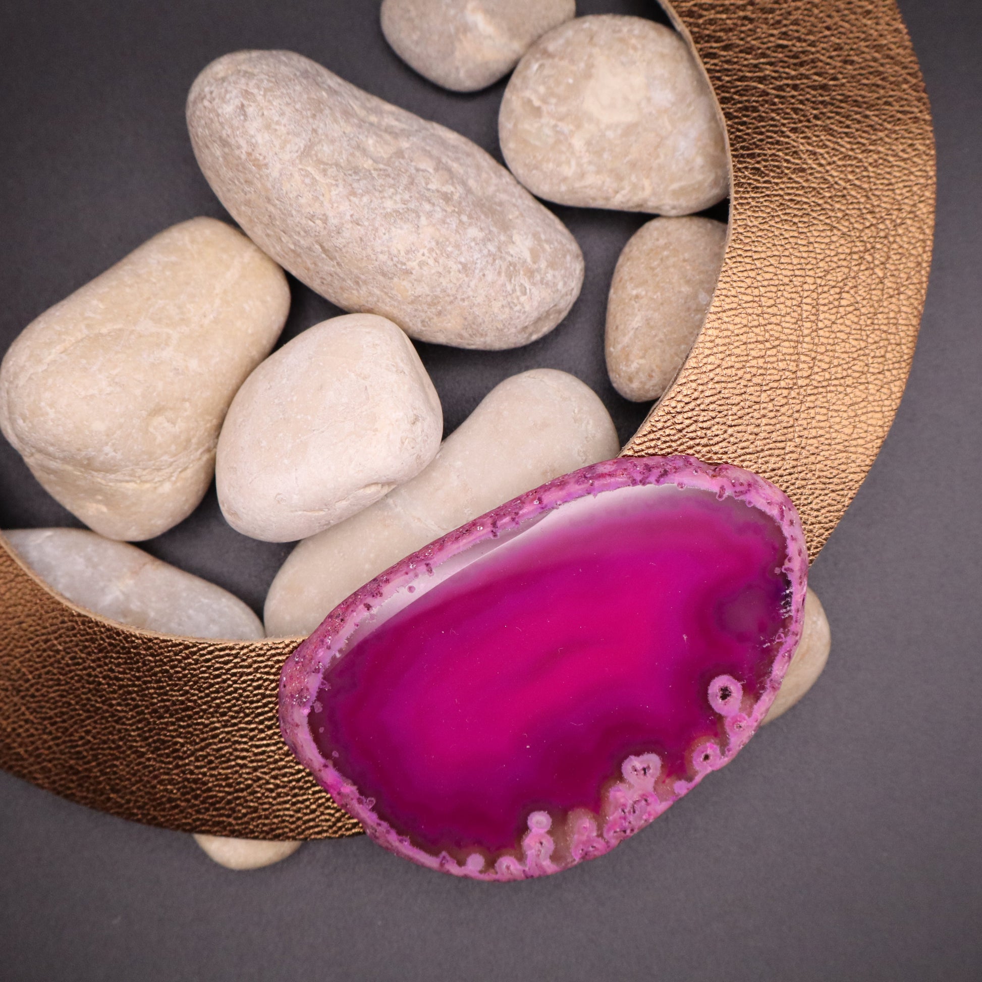 Collar en piel metalizada cobre y ágata en tonos de rosa.