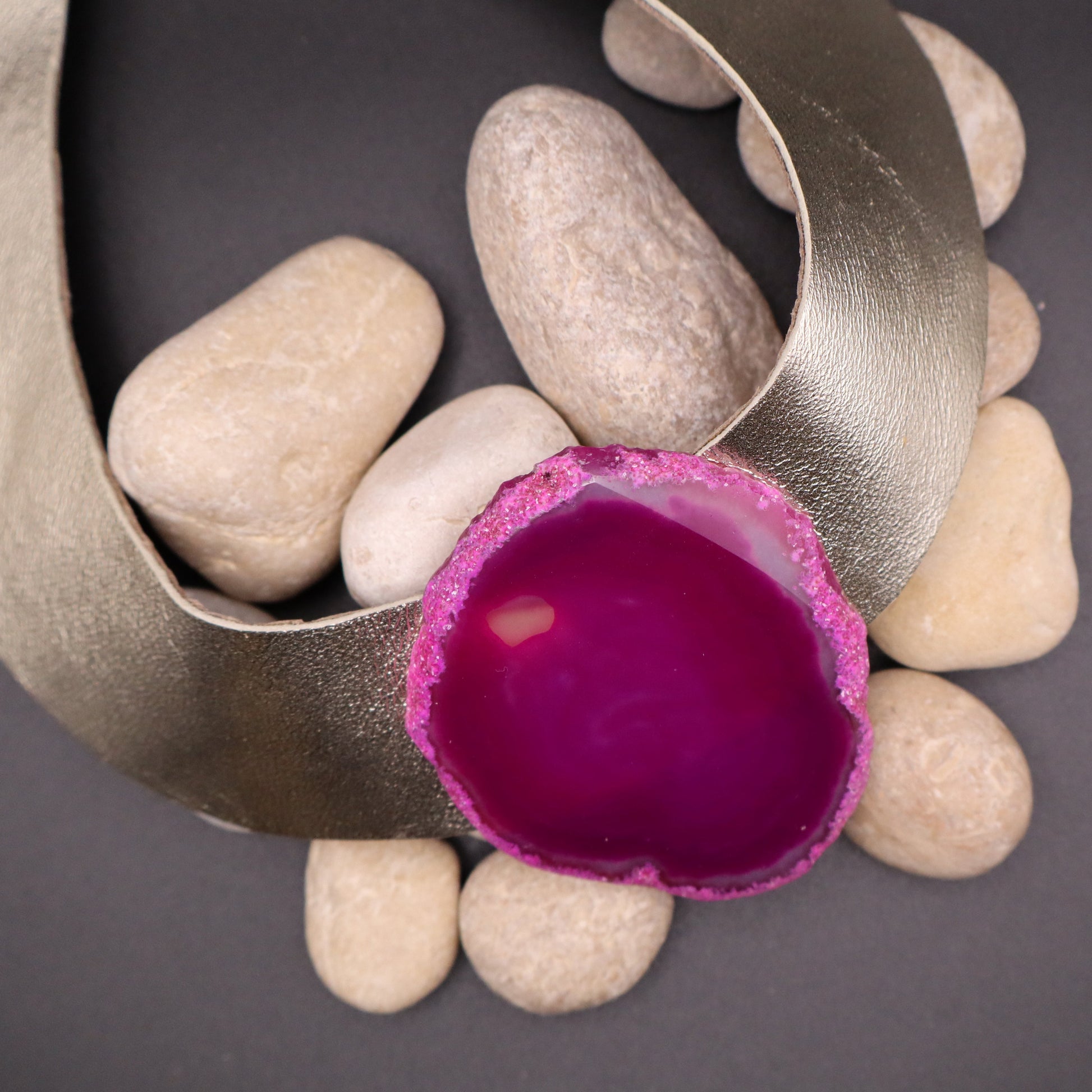 Collar en piel metalizada dorada y ágata en tonos de rosa.