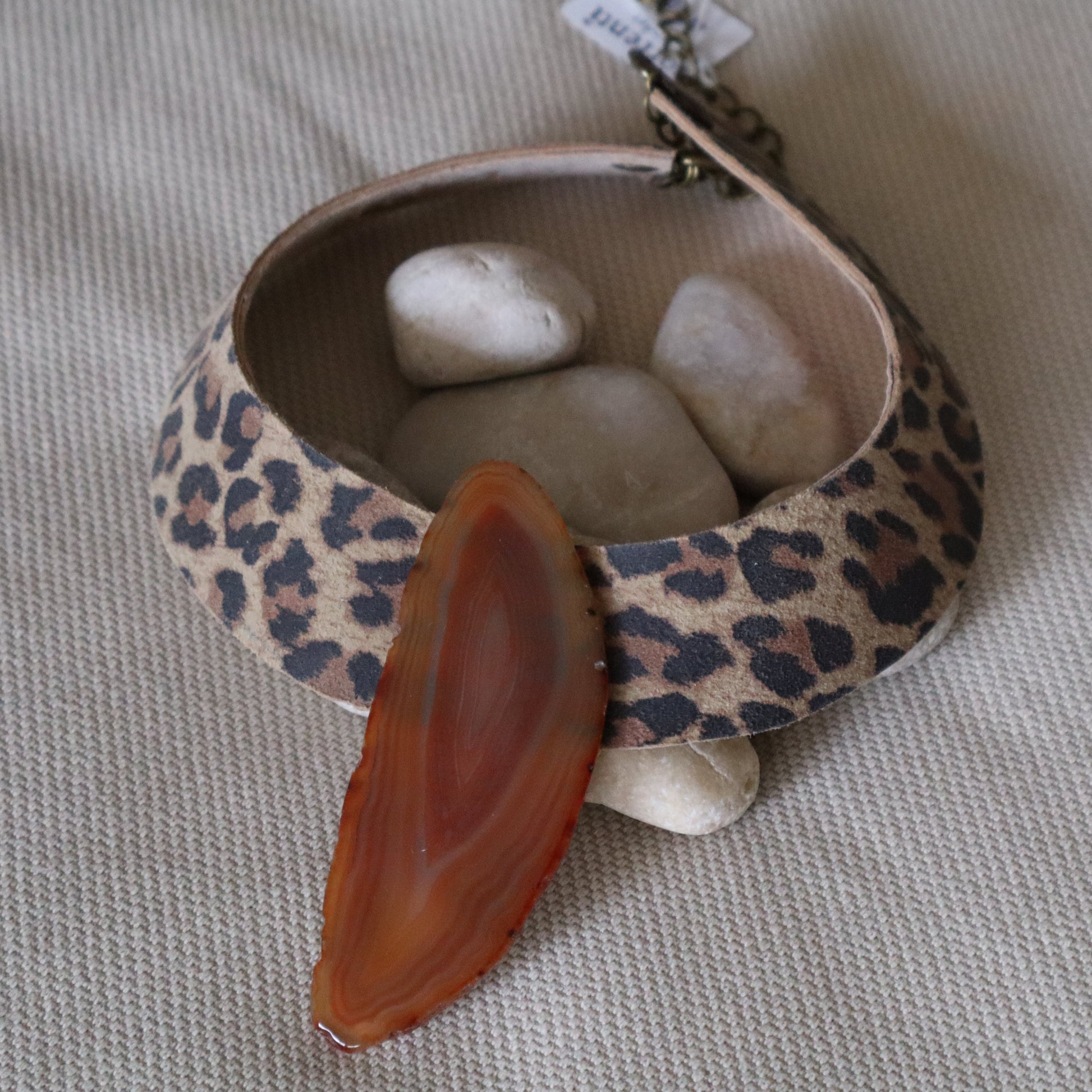 Collar en piel print leopardo claro y ágata en tonos de marrón
