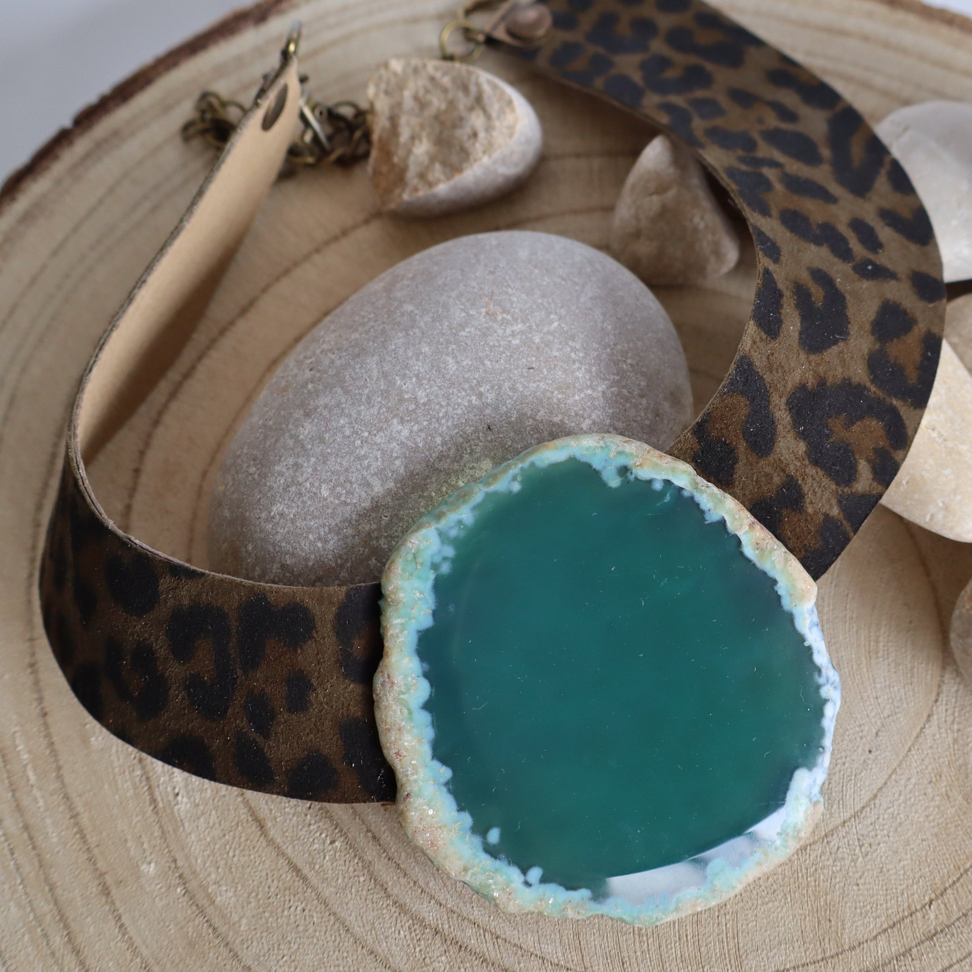 Collar en piel print leopardo marrón oscuro y ágata en tonos de verde.