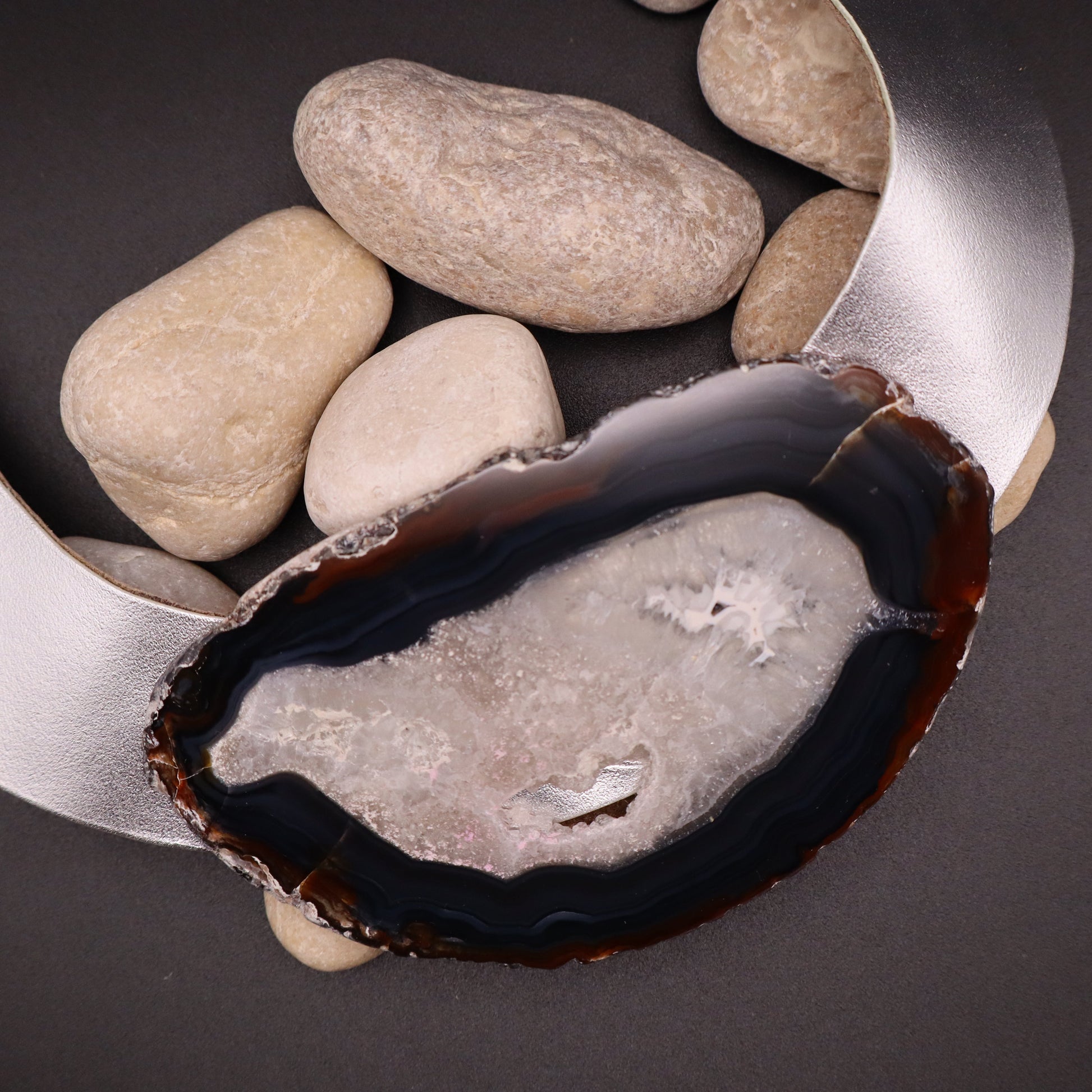 Collar en piel metalizada plateada y ágata XL en tonos de marrón cristal.