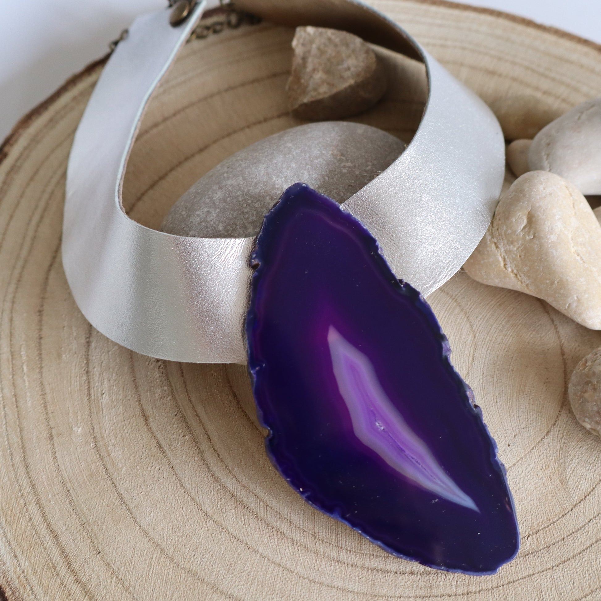 Collar en piel metalizada plateada y ágata en tonos de morado y blanco.