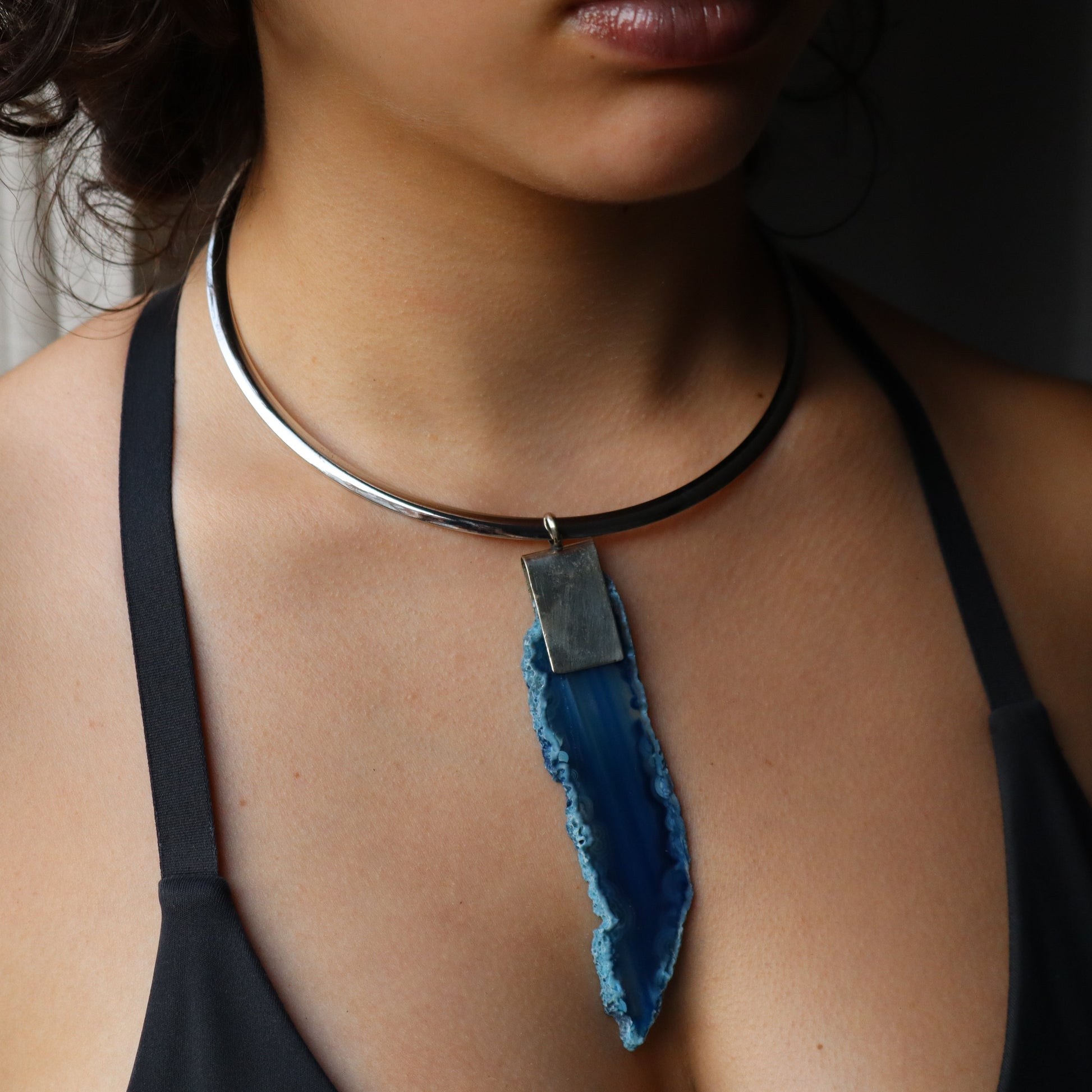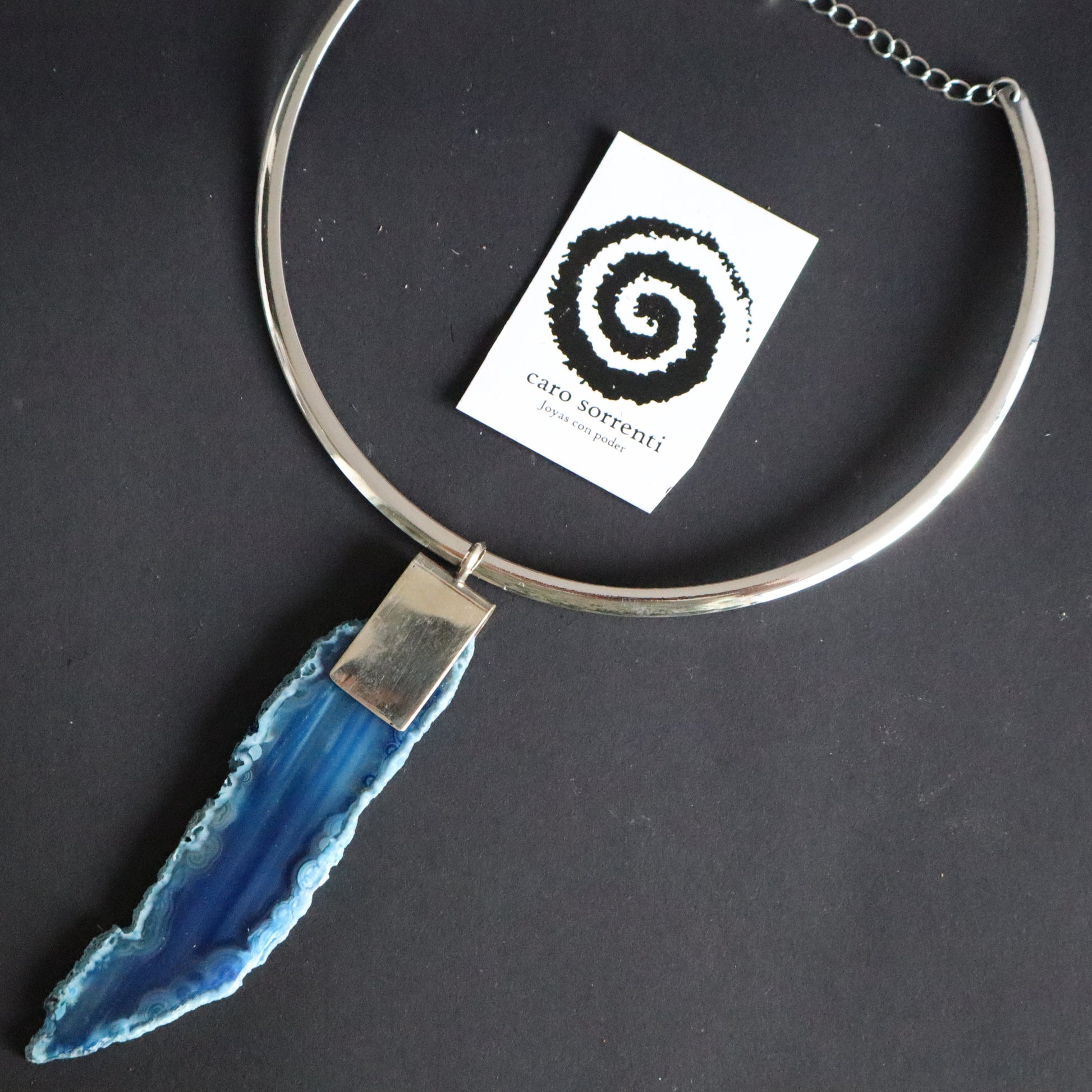 Gargantilla de acero plana en color plata con dije de ágata en tonos de azul